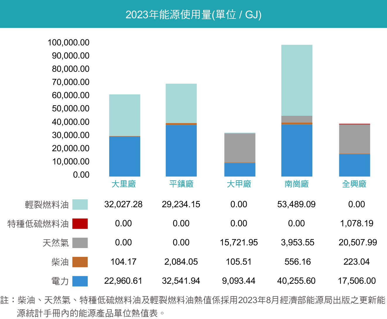 | 總能源使用量 | GJ | 314,408.62 | 400,339.62 | 373,266.02 | 281,442.72 | 345,909.62 |
