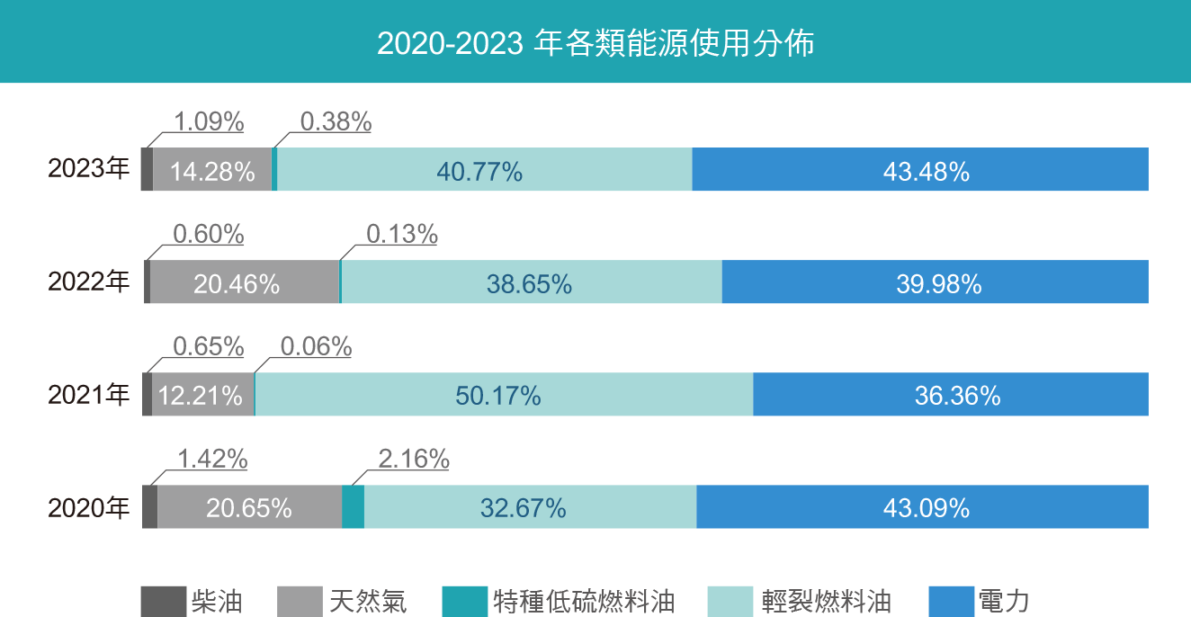| 場域 | 柴油 | 天然氣 | 特種低硫燃料油 | 輕裂解油 | 液化石油氣 | 自產沼氣 | 工業助劑 | 汽油 | 外購電力 | 合計 |