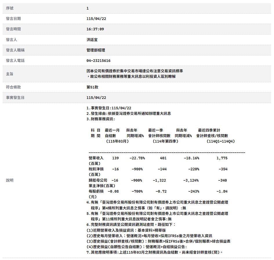 因本公司有價證券於集中交易市場達公布注意交易資訊標準 ,故公布相關財務業務等重大訊息以利投資人區別瞭解